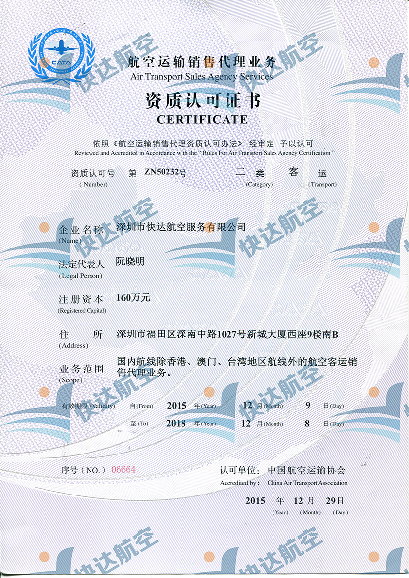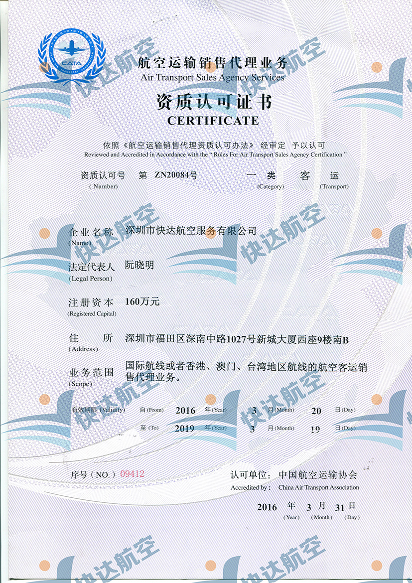 2004年 快达航空获得中国民航中南管理局、国际航空运输协会销售代理许可证书。